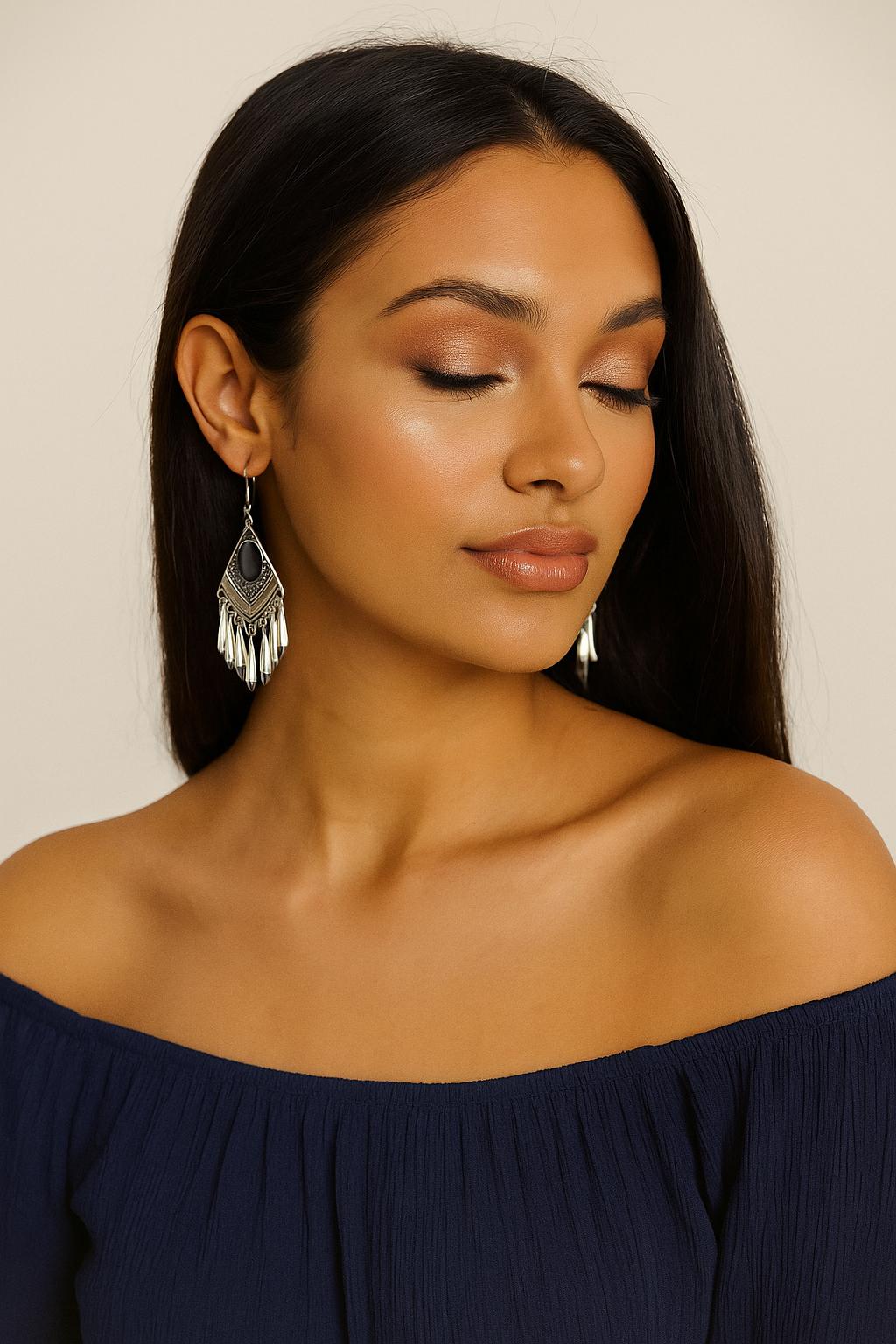 Hollywood Sensation's Black Cat's Eye Stone Boho Dangle Earrings provide a unique and fashionable touch to any ensemble. Crafted from natural stones, these earrings feature a bold, classic design that is sure to turn heads. The eye-catching black finish adds a beautiful contrast to the silver setting. These earrings are sure to become a favorite accessory for any occasion.